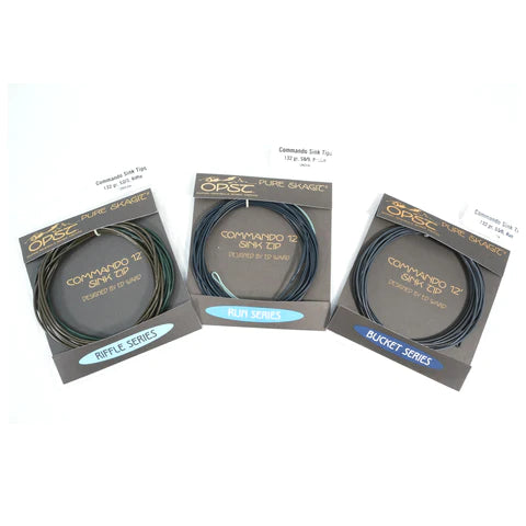 Our Commando sink tips come in 5, 7.5, 8 ,10, and 12 foot lengths. Within each length and grain weight, they come in three different sink rates, which we call Riffle, Run and Bucket, for shallow, medium depth and deep water. The exact sink rates within those three categories will vary based on length and grain weight, so not all Bucket tips are the same across grain weights, but the three sink rate within each grain weight system is a constant throughout our sink tips. This means that you can get a deeper-sinking tip or a shallower tip with the same tip grain weight, so you don’t have to change your cast to fish different depths of water. For example, all of our 5 Foot Micro Tips—the Riffle, Run, and Bucket, all weigh the same, even though there are three different sink rates, or densities.