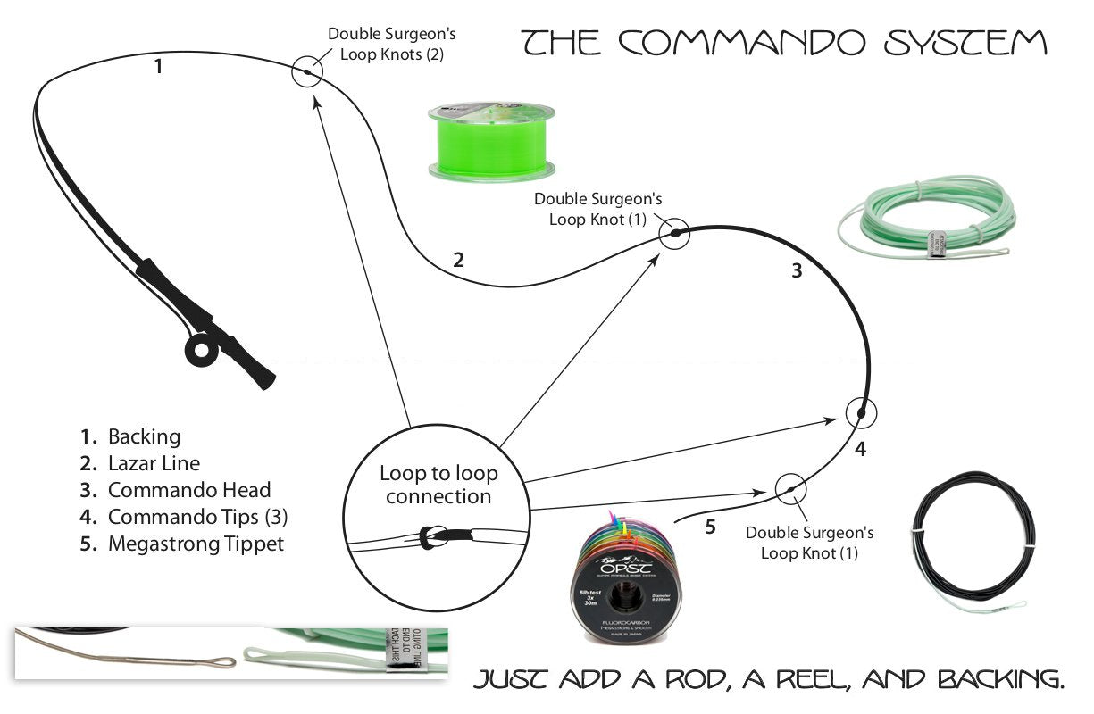 The Commando Head system starts at the running line, which comes just in front of the backing. The purpose of a running line is to connect the backing to the Commando Head and allow for long casts. It does not take an active role in the actual cast; rather, its role is to shoot out of the guides as smoothly as possible to allow the Commando Head to achieve the desired distance. Our Lazar Line running line, a super slick, supple, practically memory-free monofilament running line, is the best running line we have tried. We secure our Lazar Line to both the backing and the Commando Head with a loop to loop connection. To make the loop in the Lazar Line, we use a double or triple surgeon's loop. For some instruction on tying a triple surgeon's loop in a Lazar Line as well as some other tips, check out this video: